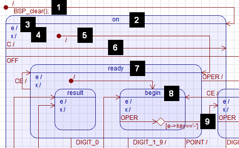 initial pseudo-state (see step [5]), which binds the state-machine to the class. The Q_STATE_DECL() macro declares two functions for every state: the "state-handler" regular member function and the "state-caller" static member function. So, for example, the declaration of the "on" state Q_STATE_DECL(on) expands to the following two declarations within the Calc class: