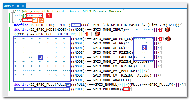 1 Trailing whitespace after the last printable character in line can cause bugs. For example, trailing whitespace after the C/C++ macro-continuation character '\' can confuse the C pre-processor and can result in a program error, as indicated by the bug icons.