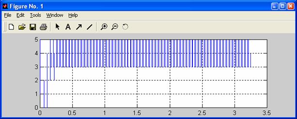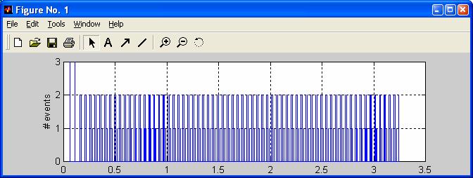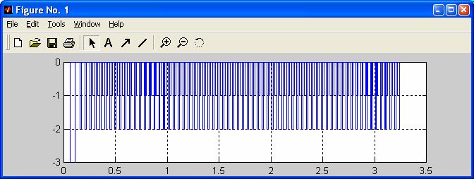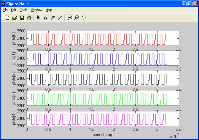 For example, the following MATLAB plot shows the timing diagrams for all Philo state machines in the DPP example application made by the philo_timing.m script located in the directory qtools/qspy/matlab (see Section qspy_files). The vertical axis represents states "thinking" (lowest), "hungry" (middle) and "eating" (top) states.