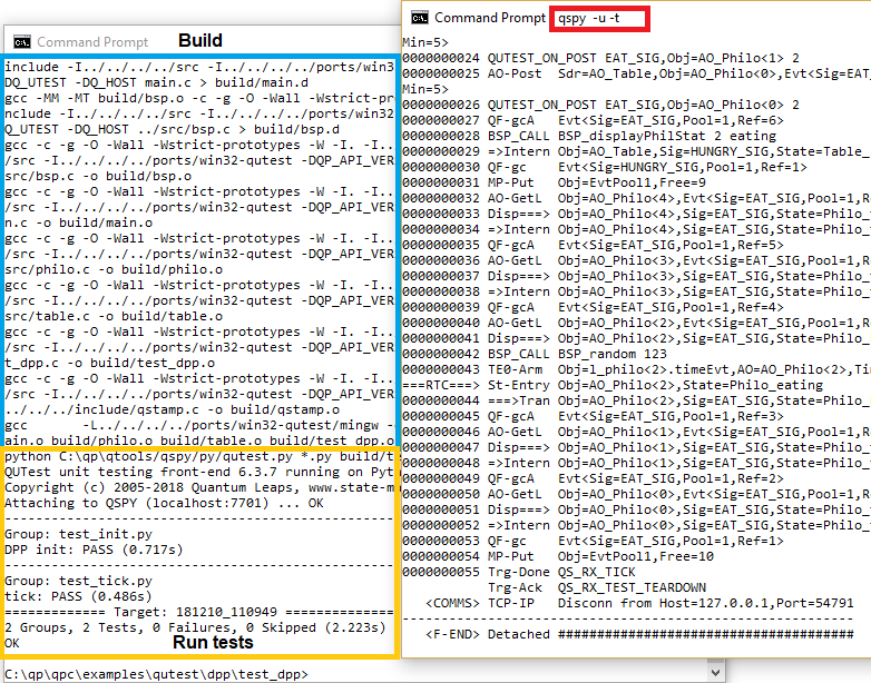 Makefile will also work on Linux and MacOS. The only difference from Windows is that you open a terminal window and change directory to ~/qp/<qpc|qpcpp>/examples/qutest/blinky/test.This will build the test fixture as a host executable and then it will run the test script (in Python). The screen shot below shows the output produced in these two command-prompt windows.