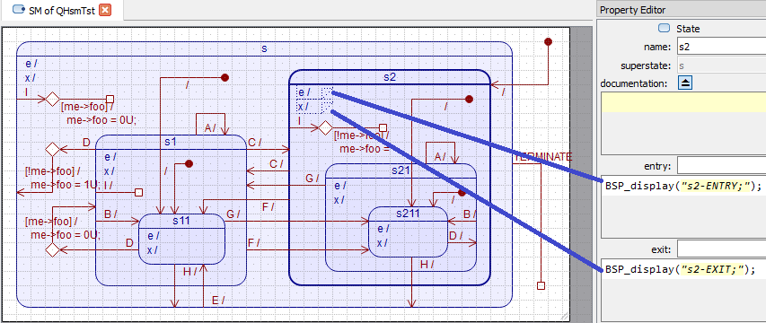The state machine executes actions on every entry/exit to states, on state transitions and on internal state transitions. These actions are all implemented by calling the BSP_display() function that outputs a succinct message about the location of the action within the state machine. For example, the entry action to state "s2" calls BSP_display("s2-ENTRY;") and the exit action from state "s2" calls BSP_display("s2-EXIT;"). These actions then are used for functional testing of the state machine.