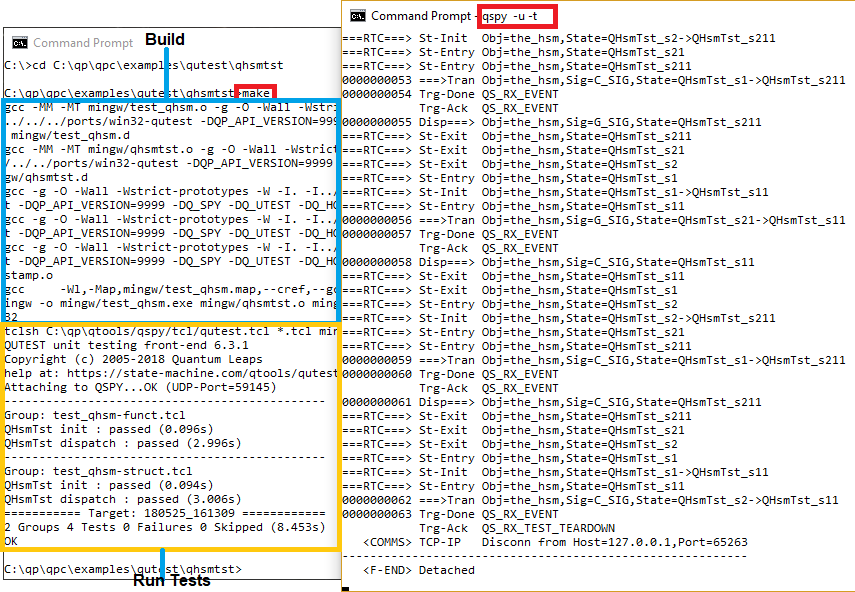 This will build the test fixture as a Windows executable and then it will run the test script. The screen shot below shows the output produced in these two command-prompt windows.