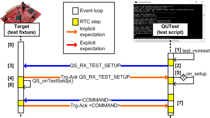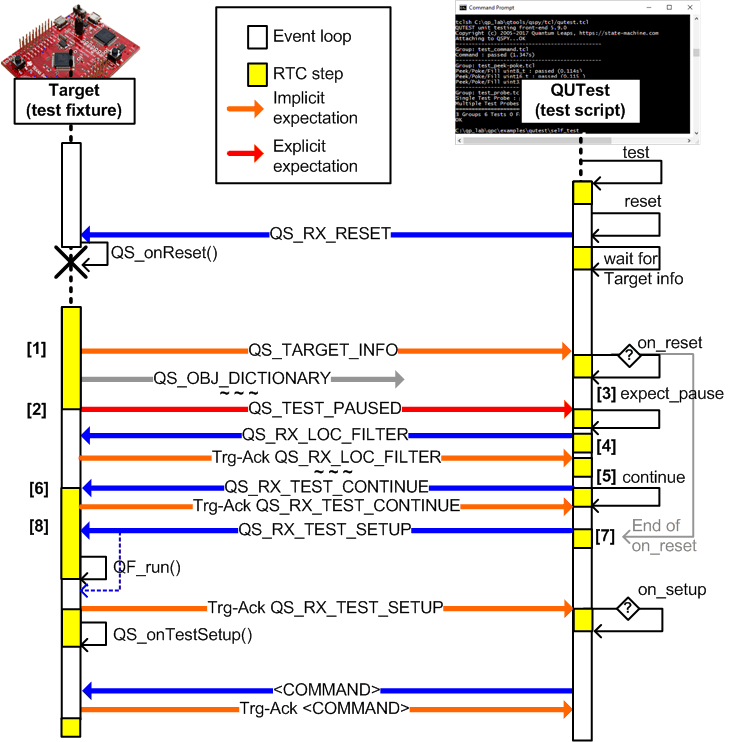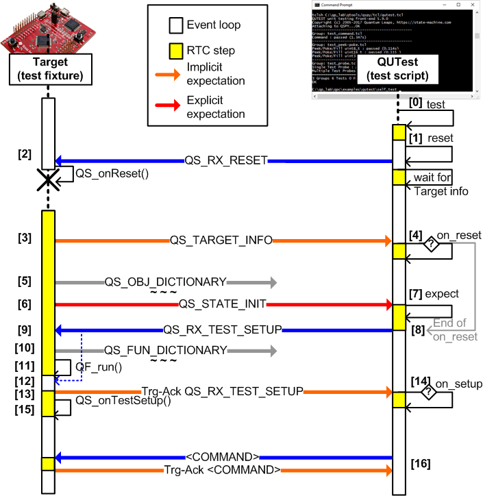on_reset() procedure ends and the test script sends QS_RX_TEST_SETUP to the Target. QS_RX_TEST_SETUP typically arrives while the test fixture still runs the initialization RTC. Therefore, QS_RX_TEST_SETUP is not processed immediately and its processing is delayed until the end of the current RTC step. QF_run(). QF_run() runs an event loop, in which it processes commands that have accumulated from the test script. QS_RX_TEST_SETUP, which has been waiting in the input buffer. QS_RX_TEST_SETUP is sent back to the test script Trg-Ack QS_RX_TEST_SETUP, the test script attempts to execute the on_setup() procedure. If on_setup() is defined in the script, it runs at this time. NOTE: The main purpose of the