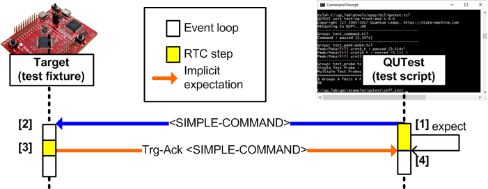 <SIMPLE-COMMAND> to the test fixture. <SIMPLE-COMMAND>). <SIMPLE-COMMAND>, the test script enters an implicit expect state, in which it waits for the "Trg-Ack <SIMPLE-COMMAND>" output from the Target. The processing of the <SIMPLE-COMMAND> ends when the next output received from the Target matches exactly the expected output. Complex test script commands might produce some output from the Target, not just the "Trg-Ack" (acknowledgement). Examples of <COMPLEX-COMMAND> include dispatch(), post() and tick(),