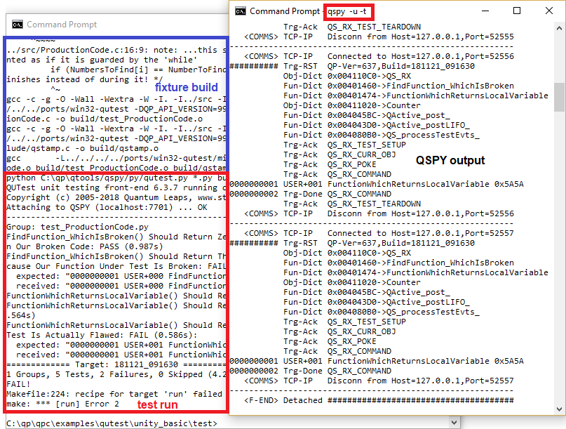 Makefile will also work on Linux and MacOS. The only difference from Windows is that you open a terminal window and change directory to ~/qp/qpc/examples/qutest/unity_basic/test.This will build the test fixture as a host executable and then it will run the test script (in Python). The screen shot below shows the output produced in these two command-prompt windows.