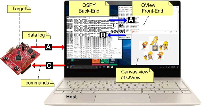 The Front-End (QView™) sends commands as UDP packets to QSPY. For some of those packets, the QSPY Back-End supplies additional information (e.g., translation between symbolic names and binary addresses according to the QS dictionaries collected from the Target).