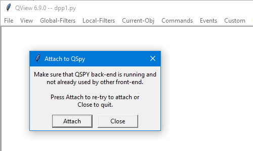 qview_before.gif Depending how you start QSPY, the dialog box might close automatically, which means that QView has successfully attached to QSPY. However, if the dialog box does not close, you need to click the Attach button to send ATTACH packet to QSPY, until QView™ receives the ATTACH response from QSPY. If you can't "attach", you can click the Close button to close QView™.