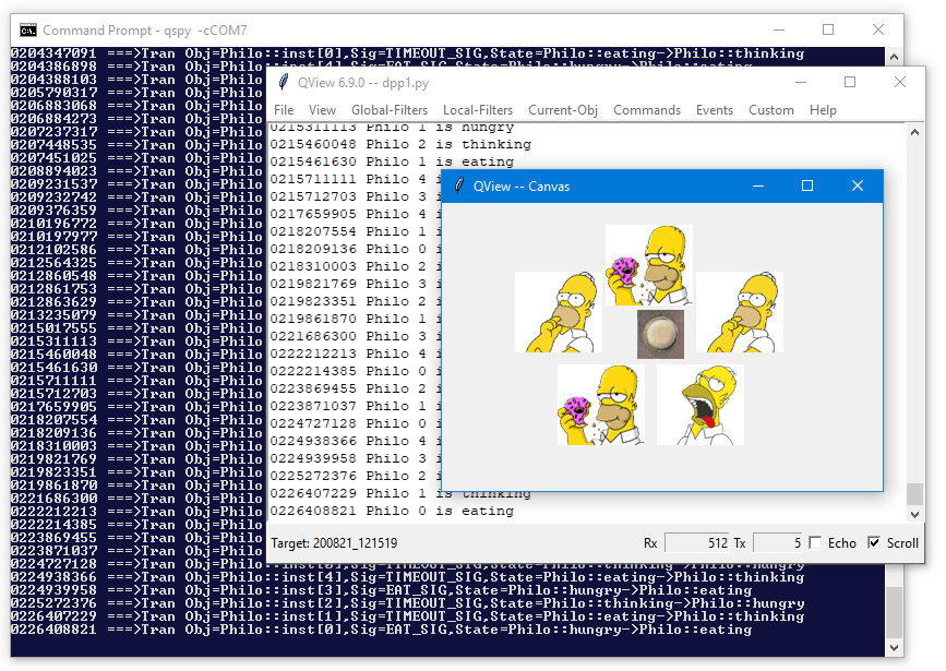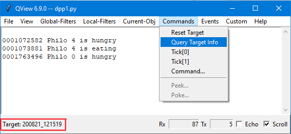 python3 qview.py dpp.py 192.168.1.101).Before QView™ can correctly interpret any data from the Target, it needs to obtain certain information about the Target, such as the sizes of object pointers, function pointers, event signals, etc. This information is provided in the QS_TARGET_INFO trace record coming from the Target.