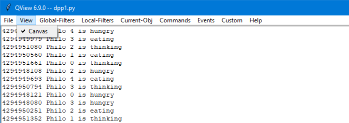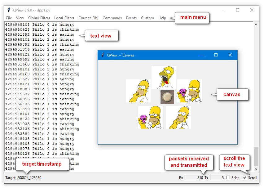 The qview.py script provides a Graphical User Interface (GUI) consisting of the main menu, the text view, the status bar, and the customizable canvas view.
