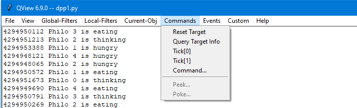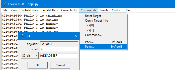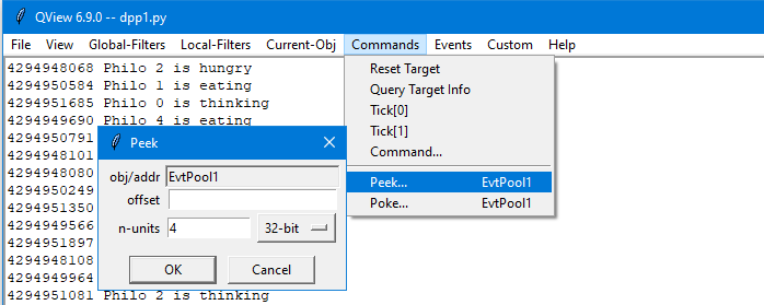 The Target responds with a QS_PEEK_DATA trace record, which you can view in QSPY human-readable output (the packet is also sent to QView, where you can react to it in your customization.)