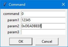 The screen shot above shows how to execute User Command number 0 with the parameters: 12345, 0xDEADBEEF and 0 (default). Both the command number and the parameters can be specified in hexadecimal (with the 0x prefix).