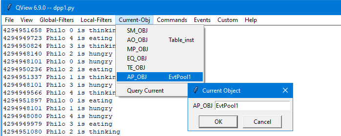 The Curr-Obj menu opens dialog boxes for each local current object. For example, the screen shot below shows the "AO_OBJ" (current Active Object). In this "Curr-Obj" dialog box you can specify the object either by its name (must match the QS dictionary), or as addresses of the objects in decimal and in hexadecimal (with the 0x prefix).