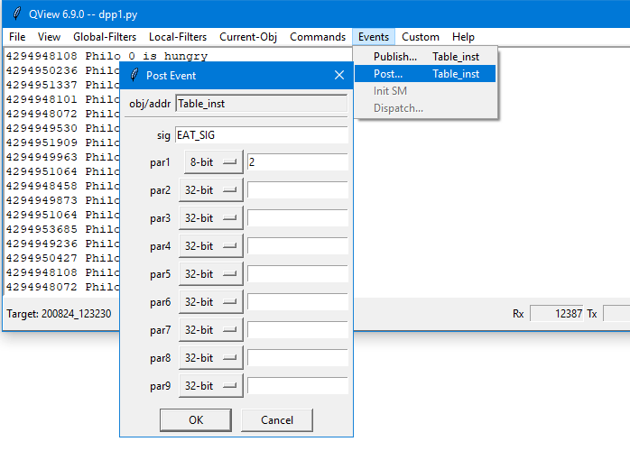 Table_inst).The Commands menu allows you to execute simple commands (without parameters) in the Target, such as Reset the Target, Query the Target, and clock Tick at rate 0 and rate 1. Also, this menu allows you to execute commands with parameters, which are quickly discussed below