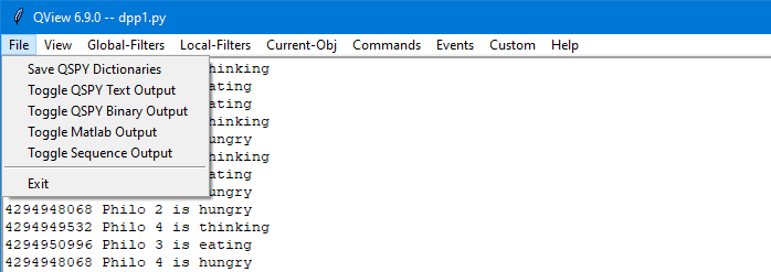 The File menu provides interface to the QSPY saving files feature. This menu allows you to trigger QSPY to save dictionaries, as well as to open/close all other file formats supported by QSPY.