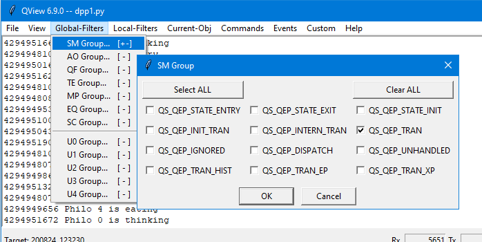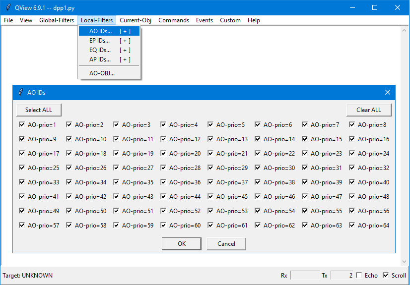 The Local Filter menu opens dialog boxes for each group of local filters. For example, the screen shot below shows the "AO-IDs" (Active Object Group). In this "AO-IDs" dialog box you can check/uncheck the individual QS-IDs (which are AO priorities in this case), or you can "Select ALL" or "Clear ALL" filters in the group.